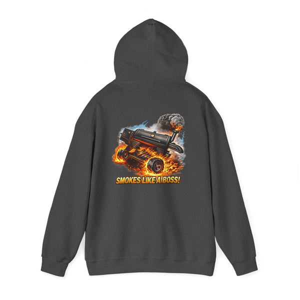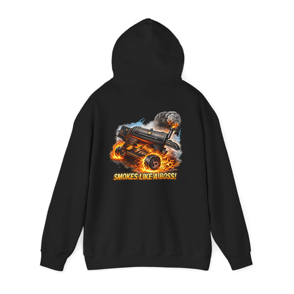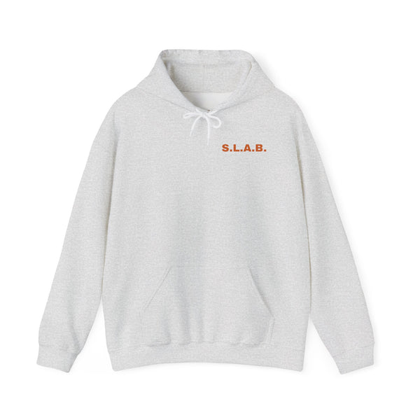 This heavyweight hoodie carries attitude with a lived-in feel. The front keeps it low-key with a small, crisp S.L.A.B. logo over the heart. Turn around and the back erupts: a lifted smoker launching plumes of smoke and flame, rendered in gritty, high-contrast color that still reads clean from across the lot.